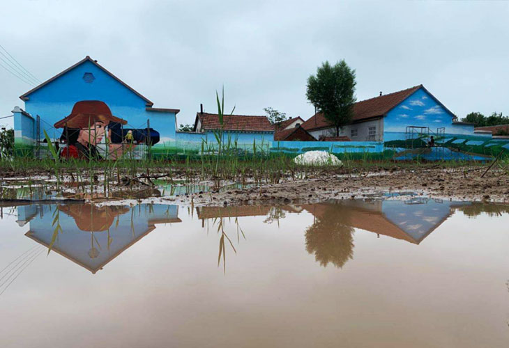 8月下旬之后天氣慢慢轉(zhuǎn)涼,雨水增多。給我們的畫師帶來了不少困難,連綿的雨天工程進(jìn)度一放再放,墻面潮濕也給墻繪繪畫施工時增加了不少難度。