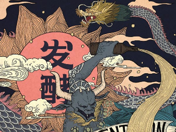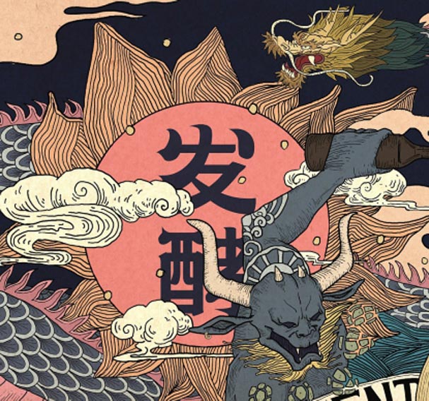 然后我們在右上角的位置加了龍的元素,一方面是想體現(xiàn)一開始所說的酒文化的的問題,另一方面是為畫面考慮,一是右上角的位置有空缺,二是和下面的惡魔有一個互動,組成畫面的動態(tài)感。