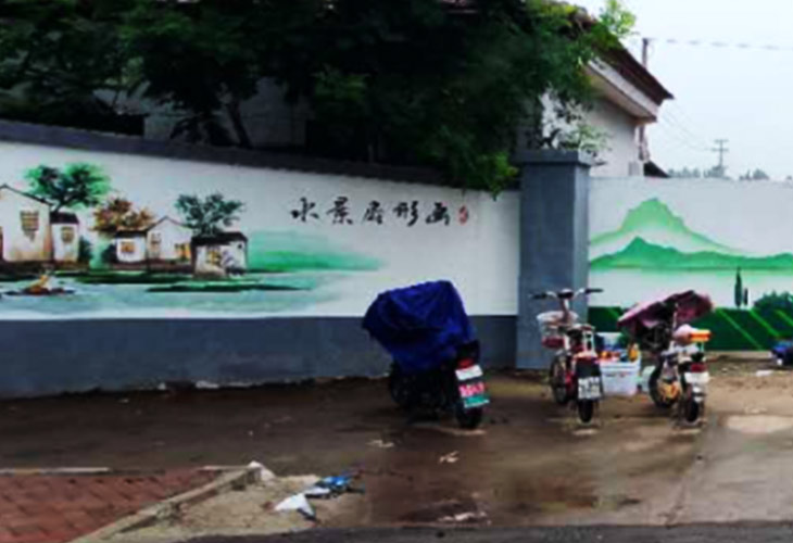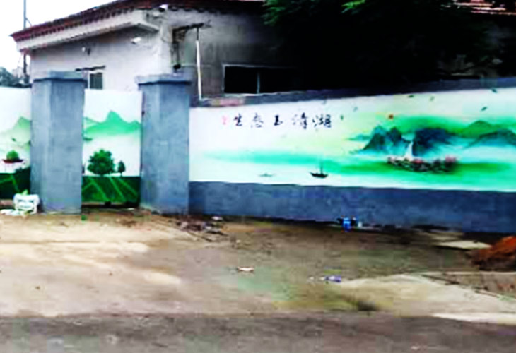 美化區(qū):原本光禿禿的墻面和大門經(jīng)過畫師的“打磨”從而出現(xiàn)了一面典雅的墻繪畫面——使得這里變得光鮮亮麗,一幅幅的水墨畫增添了這個(gè)村子的光彩。蕭鼓追隨村社近,衣冠簡(jiǎn)樸古風(fēng)存。左邊是湖邊村落,水景扇形畫。