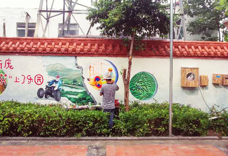 墻繪施工的地方是新龐村,這個(gè)村子是擠在玉清湖水庫、濟(jì)西濕地公園、小清河濕地公園南面的一座小村莊。村口有種植的一大片綠化進(jìn)來之后有幾個(gè)大院子,就是我們今天的主角 新龐——艾上樂園。